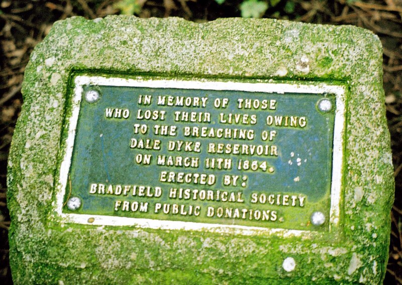 The Clob stone (Centre Line of Old Bank) marking the location of the original breached dam wall…. The new one was built 2,000ft (600m) up the valley…. Image : Mick Knapton – own work – CC BY-SA 3.0