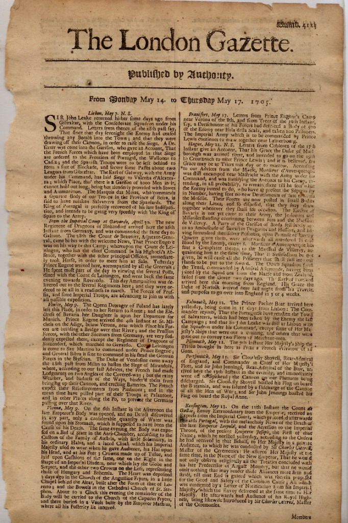The London Gazette 14-17 May 1705 – Public domain